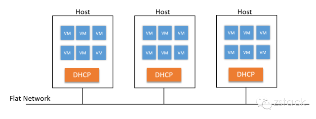 Flat Network Provider是一种新的网络服务提供模式,它提供DHCP和Userdata服务。相对于已有的Virtual Router Provider,Flat Network Provider最大的优势在于不需要启动一个Virtual Router虚拟机就可以为VM提供DHCP服务,这大大简化了部署一个扁平网络的复杂度。此外,由于采用了分布式DHCP系统,Flat Network Provider不存在传统DHCP系统的单点失败情况,因为每个物理机上都会有一个DHCP服务器服务运行在该物理机上的VM。在高并发创建或启动VM的时候,DHCP的负载会被分发到不同物理机上去,大大提供了系统整体的并发性。下图是分布式DHCP系统的一个总体架构图: