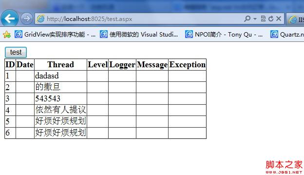首先我们新建了一个Web项目,在项目中添加了一个页面叫做test.aspx,其中添加了一个按钮,当点击了这个按钮的时候会连接数据库把数据库中的数据提取出来显示在界面上的gridView上。
