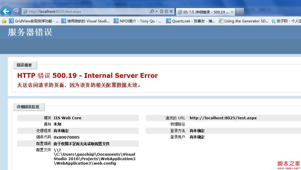 可能有的园友要骂我了,怎么没有看到那个数据库无法登录的错误,我只能说一句抱歉了,因为我确实没有模拟出来那个错误。因为我用的是Windows 7系统,其实在出现配置错误的时候我预想的应该是出现哪个数据库连接登录错误。等我模拟到那个登录错误的时候再拿出来。但是按照设置权限应该可以解决所有的权限错误问题。